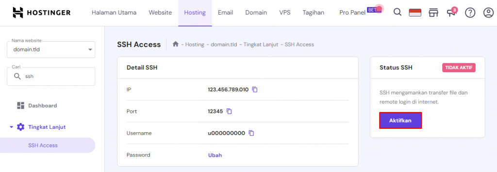 Untuk menggunakannya, aktifkan akses SSH di hPanel. Berikut caranya: