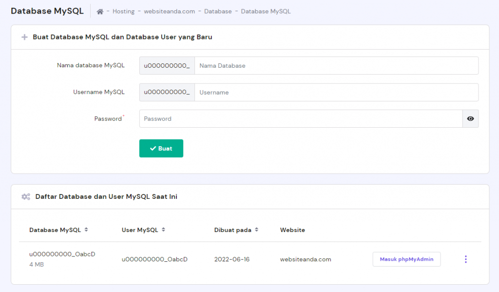 Cara lain untuk melihat informasi ini adalah dengan mencarinya di control panel web hosting. Login ke akun web hosting Anda lalu cari bagian Database.