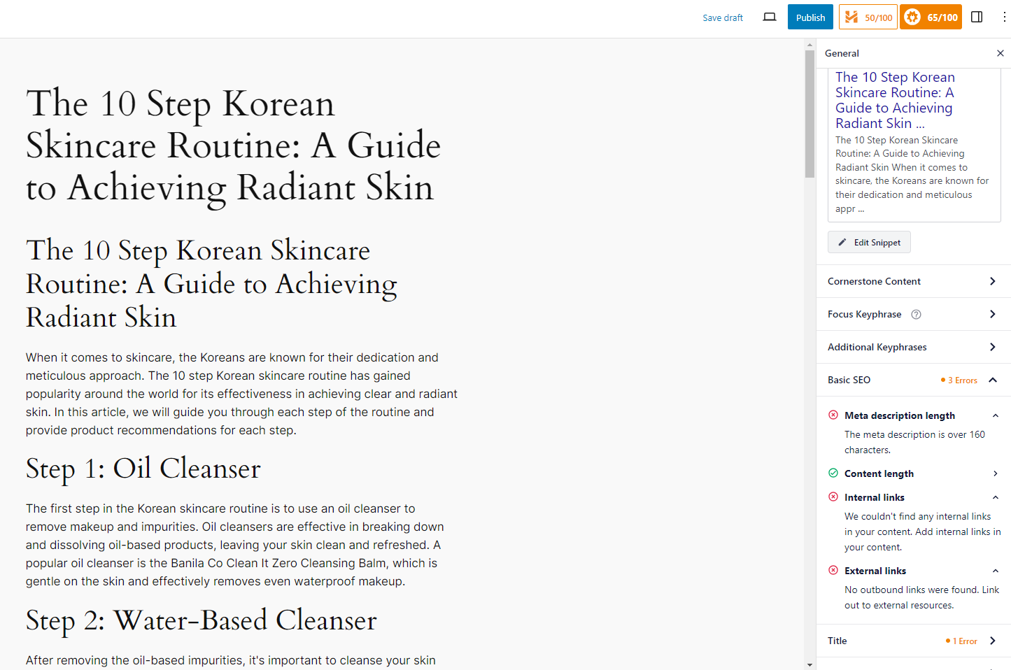 A highlight of AIOSEO is its TruSEO feature, an on-page analysis tool that scores your content and provides actionable tips to boost your page’s ranking potential. It assesses elements such as keyword usage, meta robot tags, and content readability.