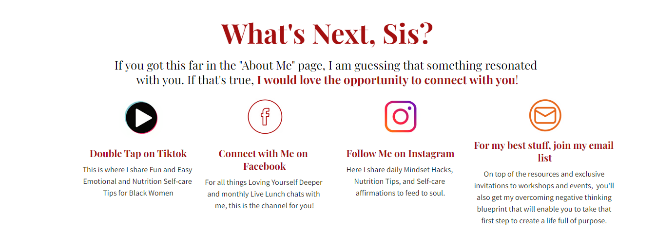 On the About Me page, Yahudith added social media icons to their profiles. She elevated it by adding a short sentence about what each platform is best for. This helps potential clients choose the platform for getting to know this health coach better.