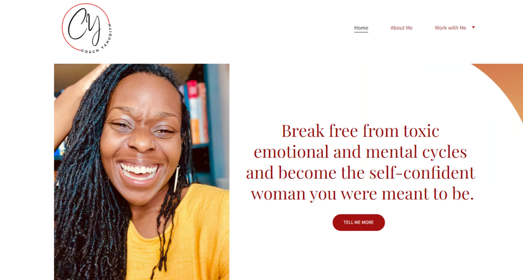Coach Yahudith is a life and wellness coach who helps women improve their mindset and break toxic mental cycles. The website follows the best web design practices – it has a one-line sentence to help attract visitors’ attention, a white background, simple shapes, and consistent colors.