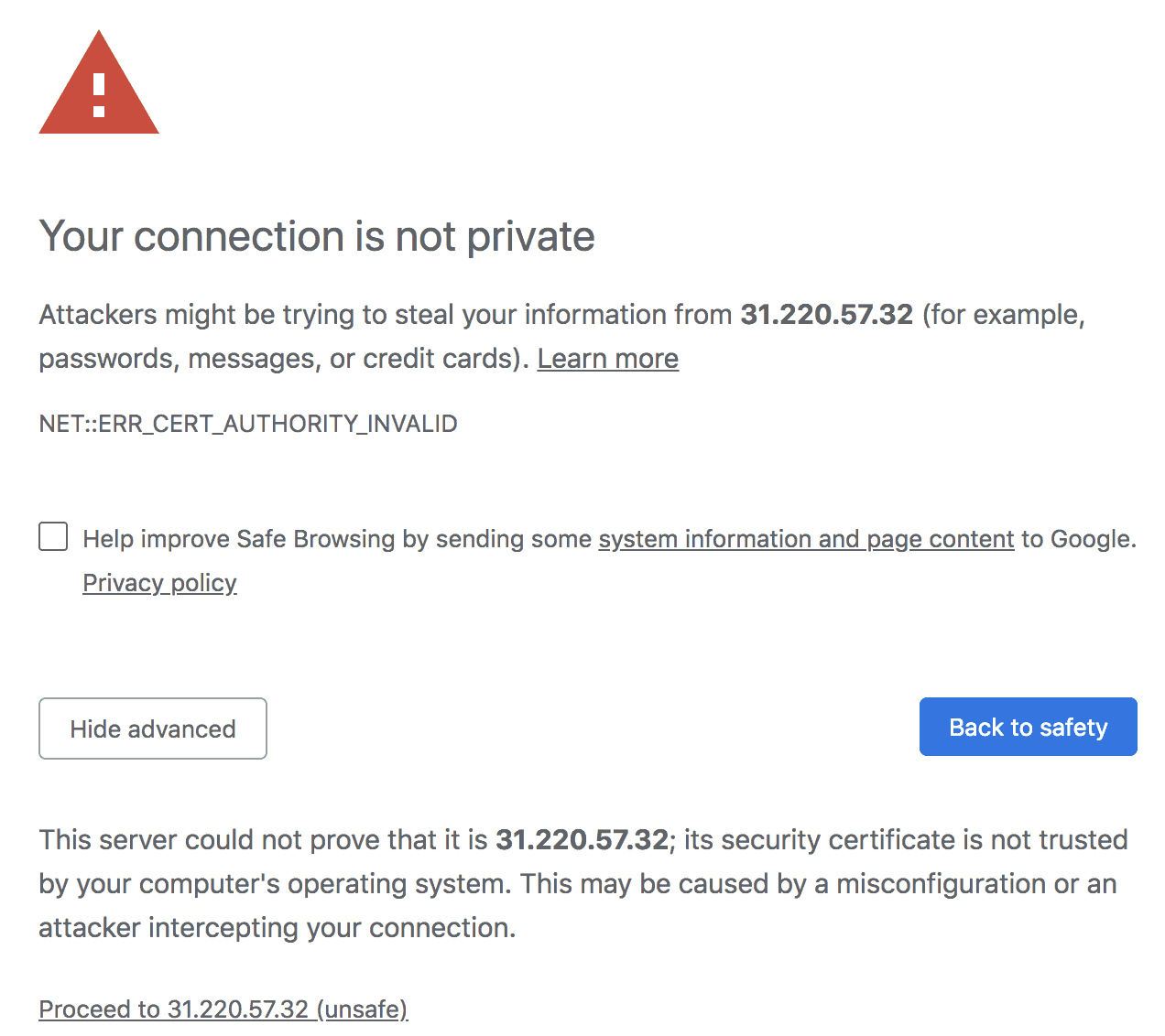 If you’re getting your connection is not private warning, don’t worry. WHM uses a self-signed certificate, which is not recognized by your browser. If you use Chrome, simply click the Advanced button and select Proceed to IP Address (unsafe).