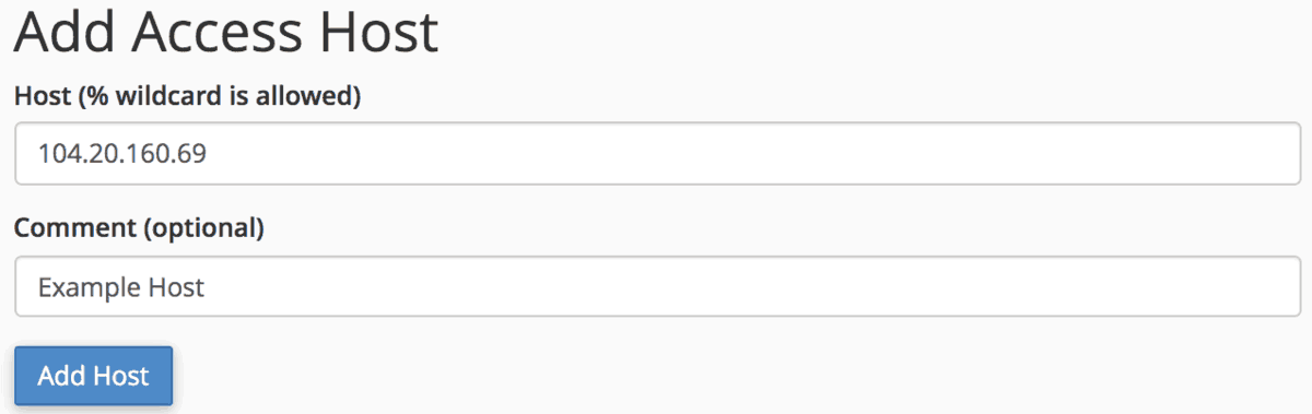 Enter the hostname or IP address in the Host field. If you want to access the database from the localhost, you can use your public IP address which can be found here. Or, simply enter a fully qualified domain name, like www.3dcart.com, then click Add Host.