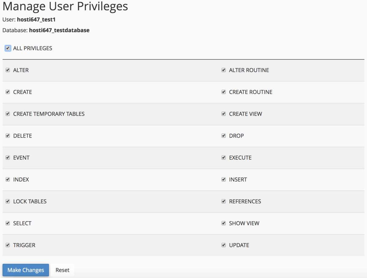In this step, all you have to do is to grant privileges to the user. If you’re creating an admin, you can check ALL PRIVILEGES and click the Make Changes button.