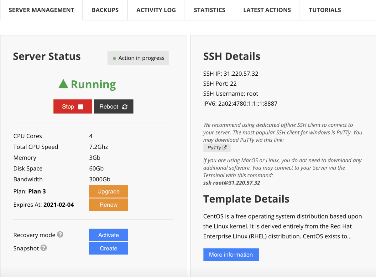 Login to your VPS member area and copy the dedicated IP, SSH username and password, and port values to a text editor, we’ll need it for the next step. If you’re on Hostinger, the details are available under the Server Management section.