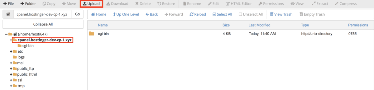 First of all, there’s a window section that shows you a folder tree on the left, and a folder’s contents on the right. You can navigate to a folder by clicking on the appropriate one. For example, clicking the public_html folder will show you its content – .well-known, cgi-bin, robots.txt, etc.