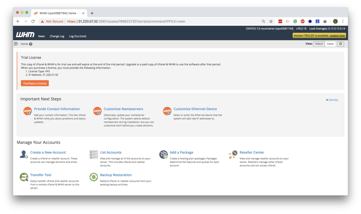 Now you’ve successfully installed WHM/cPanel on your server. Note that the trial license activates immediately, you can use it for free up to 15-days. After that, you need to purchase a full license. Next, we’ll show you how to create a new feature list in WHM.