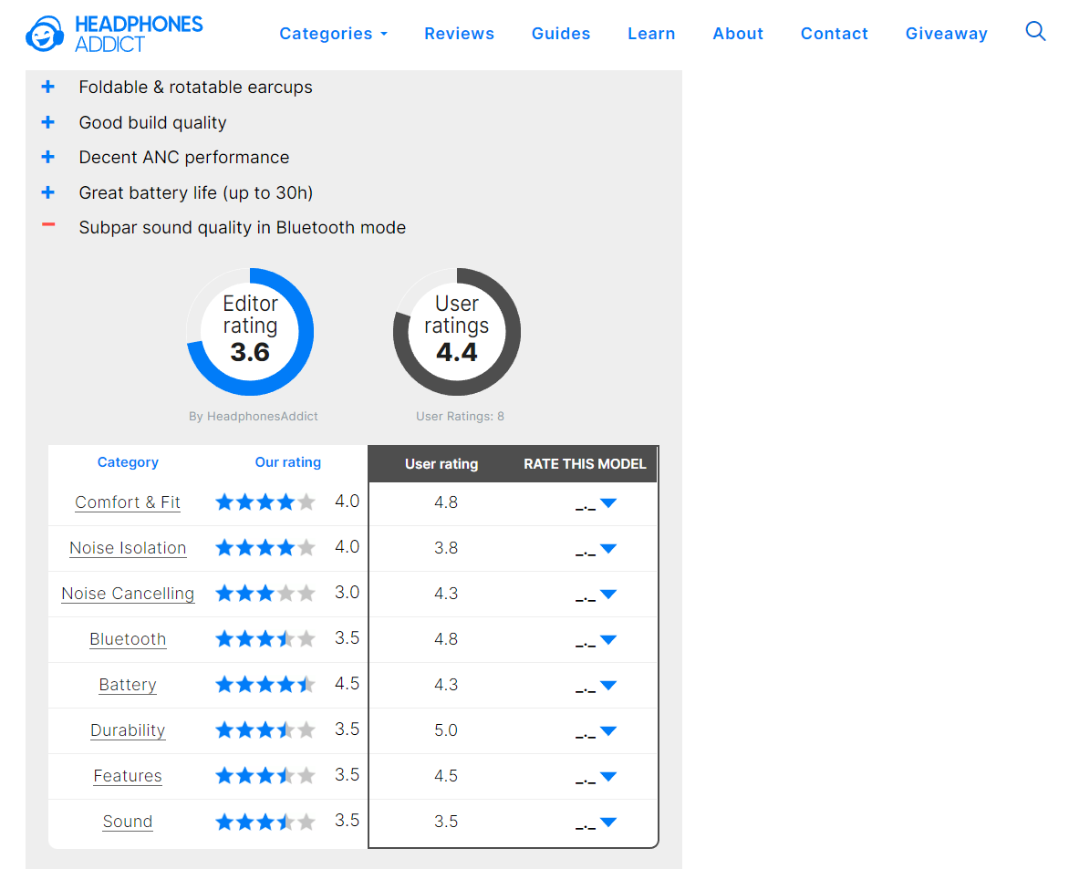 Marketers should add affiliate links with honest reviews of the products or services. For example, Headphones Addict shows their professional review and user ratings as social proof of each product they promote.