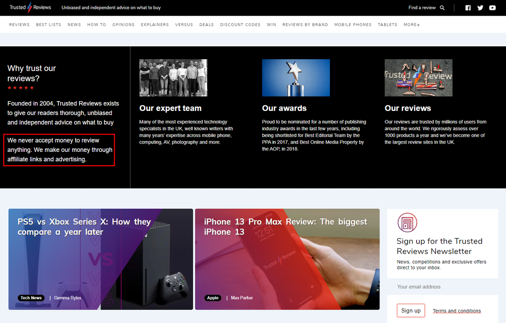 Another option is to include the disclaimer on the homepage. For example, Trusted Reviews has explained that they only get commissions from affiliate links and advertising, not their reviews.