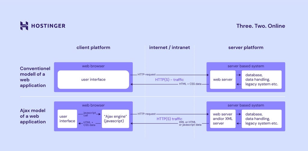 | The web server sends the requested data to the browser. | The XMLHttpRequest object sends a request for the updated page data to the web server. Subsequently, the latter processes the request and sends it back to the browser. |