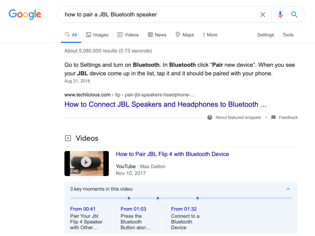When a user searches for “how to pair a JBL Bluetooth speaker” Google will present results from pages or videos that contain instructions of some kind.