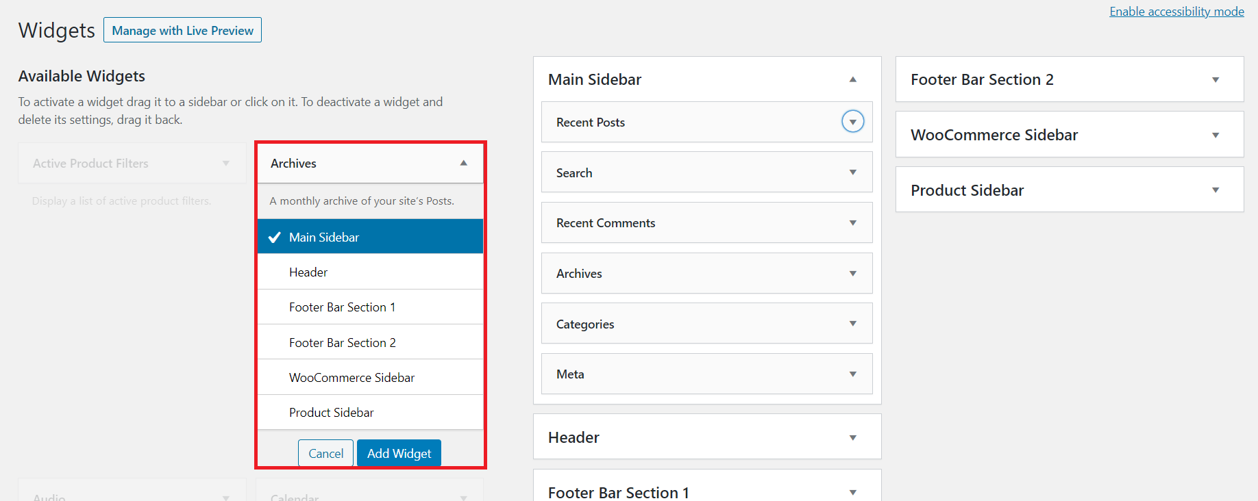 Besides using the drag-and-drop method, it’s also possible to add widgets to a widget area by clicking on it and expanding the location option.