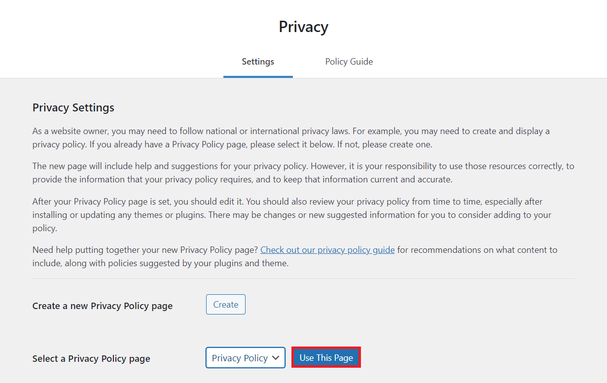 Select your new WordPress page in the Change your Privacy Policy page section and click Use This Page.