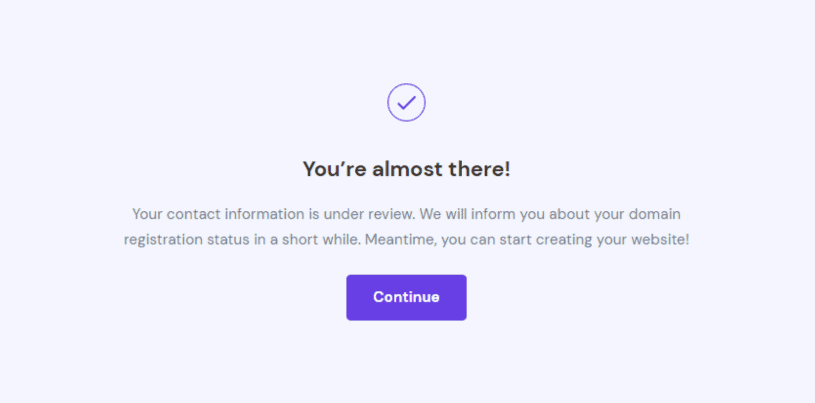 Dopo aver inviato i vostri dati, la registrazione del nome di dominio verrà elaborata. Questa operazione potrebbe richiedere un certo tempo, quindi dovrete ricontrollare il pannello di controllo o la vostra e-mail per verificare se la registrazione è stata confermata.