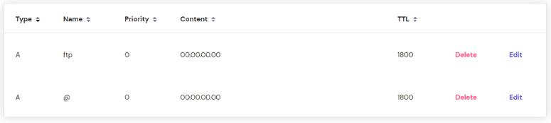 Ogni nome di dominio può avere solo una voce DNS di tipo A record. Tuttavia, per impostazione predefinita, su hPanel sono presenti due record A, uno per il tuo dominio (@) e uno per FTP. Entrambi puntano allo stesso indirizzo IP.