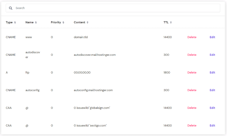 Sotto puoi trovare una tabella dei record esistenti. Utilizza la barra di ricerca per trovare il file di zona DNS esatto che stai cercando, quindi Elimina o modifica un record esistente selezionando Modifica.