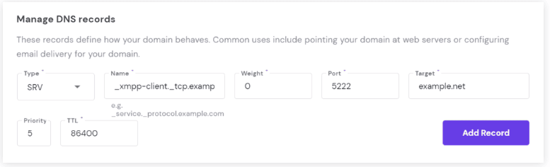 Se si utilizza Hostinger, per impostazione predefinita non esiste un record SRV, ma è possibile aggiungerne uno. Ad esempio, se si desidera aggiungere un record SRV per un servizio di messaggistica istantanea XMPP.