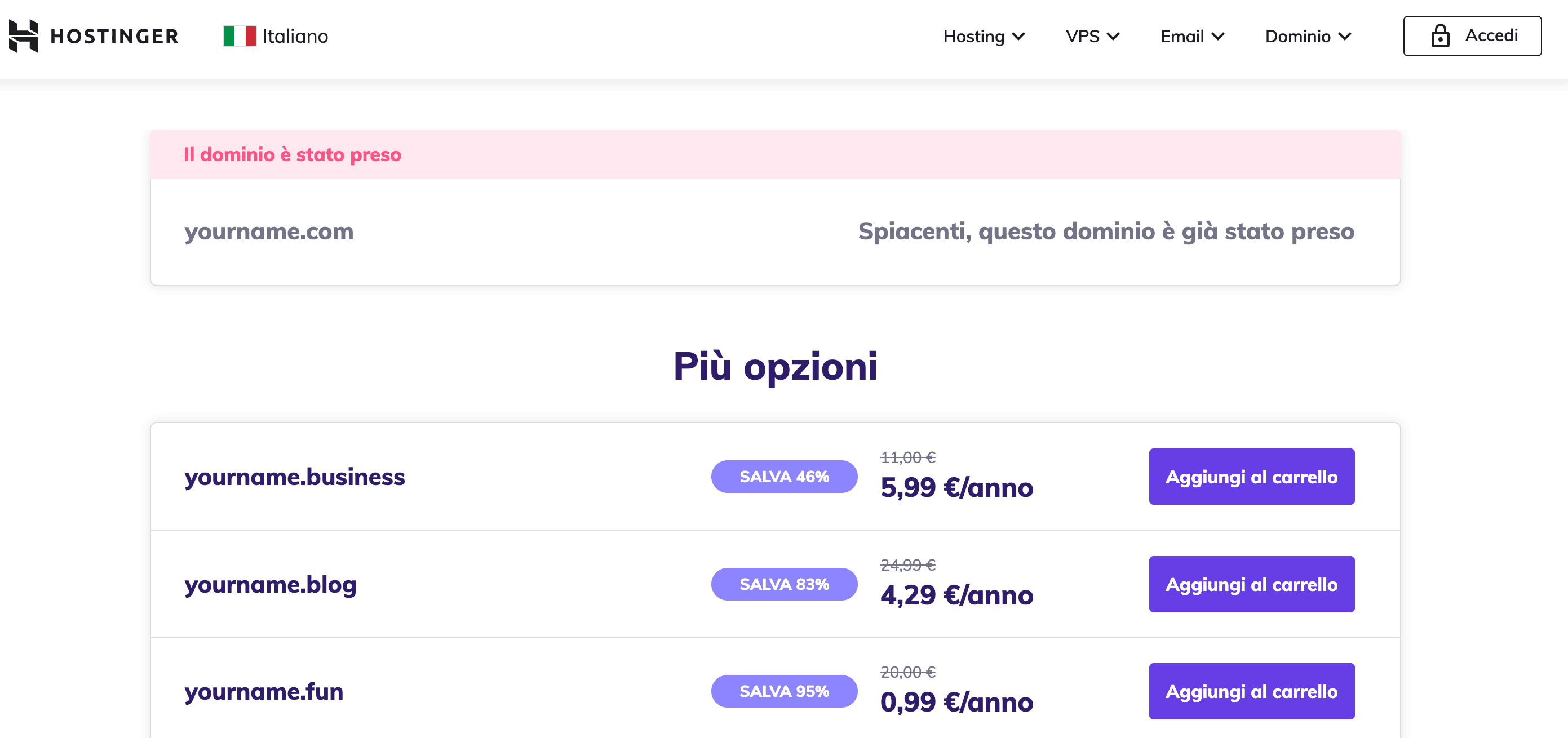 I nomi di dominio più popolari sono spesso più costosi e potrebbero essere già occupati. Alcuni generatori offrono opzioni se il dominio desiderato non è disponibile. Con un servizio di hosting come Hostinger, gli utenti possono scegliere un altro dominio di primo livello (TLD) con lo stesso nome o un’alternativa.