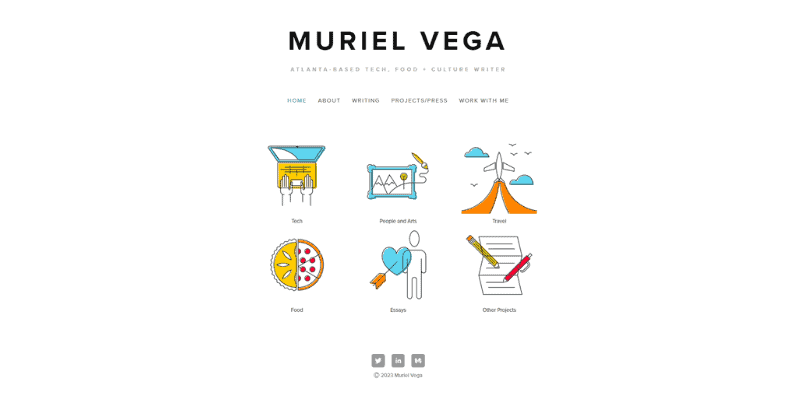 Muriel Vega è una scrittrice freelance di tecnologia, cibo e cultura che ha lavorato con diversi brand famosi, tra cui The Guardian e Patreon. Il suo portfolio è semplice ma efficace nel mostrare ai potenziali datori di lavoro le sue capacità di scrittura.