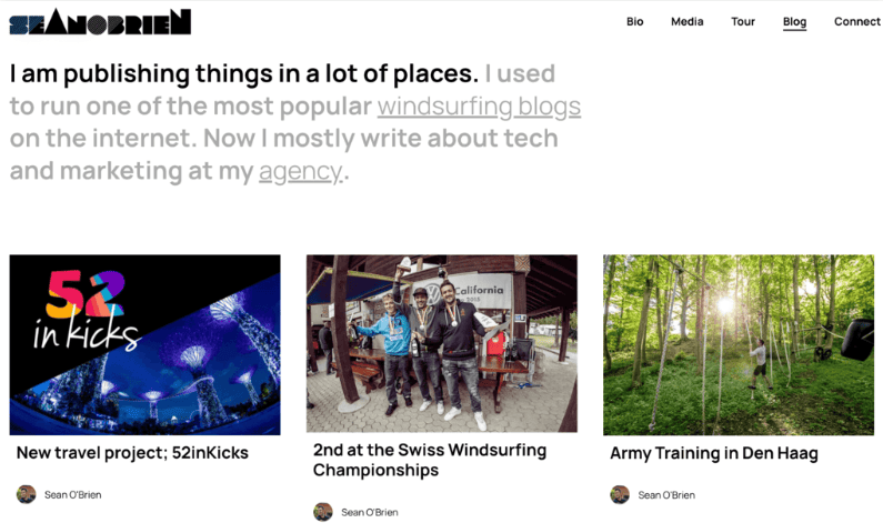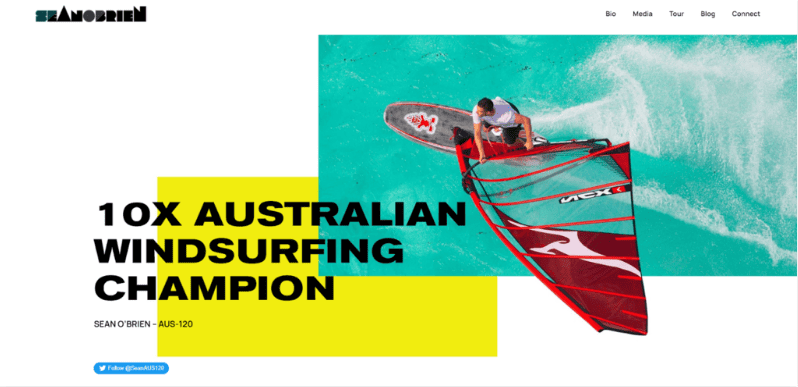 Sean O’Brien è un windsurfista che ha vinto campionati in tutto il mondo. Le informazioni sono riportate nella parte superiore della homepage, in modo che i visitatori sappiano immediatamente chi è.