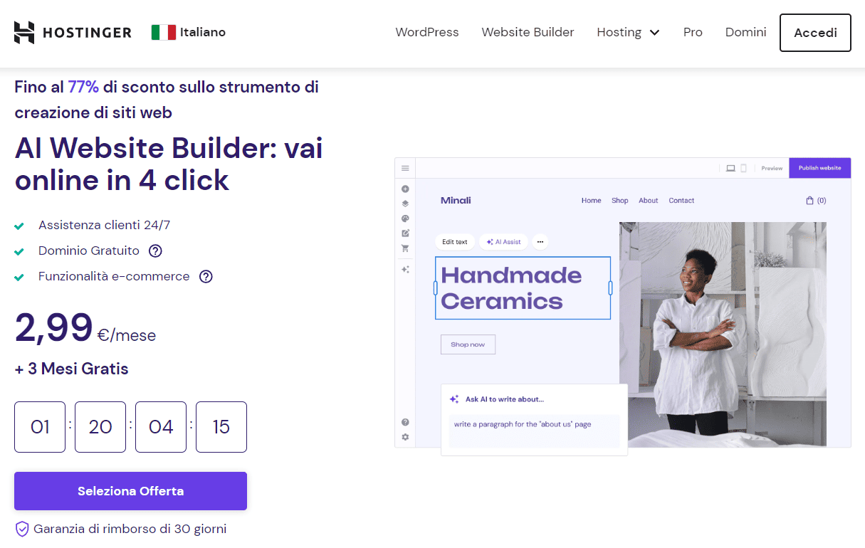 Grazie alla sua tecnologia di IA all’avanguardia, il Website Builder di Hostinger ti permette di creare un negozio di e-commerce professionale che risuoni con il tuo brand. Oltre agli strumenti AI e SEO, si ottiene anche hosting, un nome di dominio gratuito e account di posta elettronica, il tutto gestito comodamente da un’unica dashboard.
