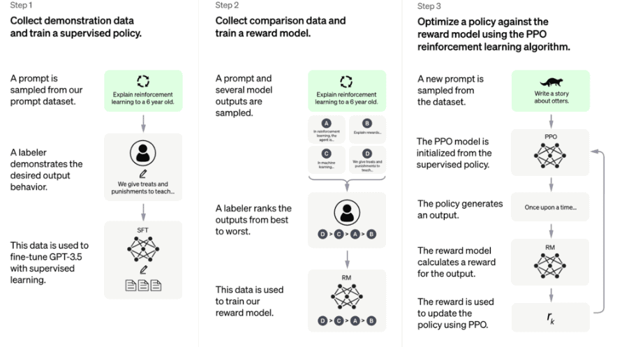 La differenza con OpenAI è che ChatGPT viene addestrato con il metodo Reinforcement Learning from Human Feedback (RLHF). Questo metodo incorpora il feedback umano per misurare e classificare le risposte in base alla loro qualità.