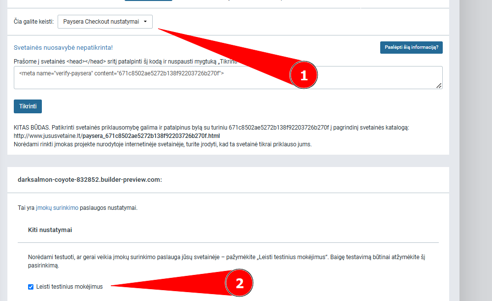 Prieš pateikiant svetainę peržiūrai atidarykite “Paysera checkout nustatymai”, Prie “Kiti nustatymai” įgalinkite testinius mokėjimus: