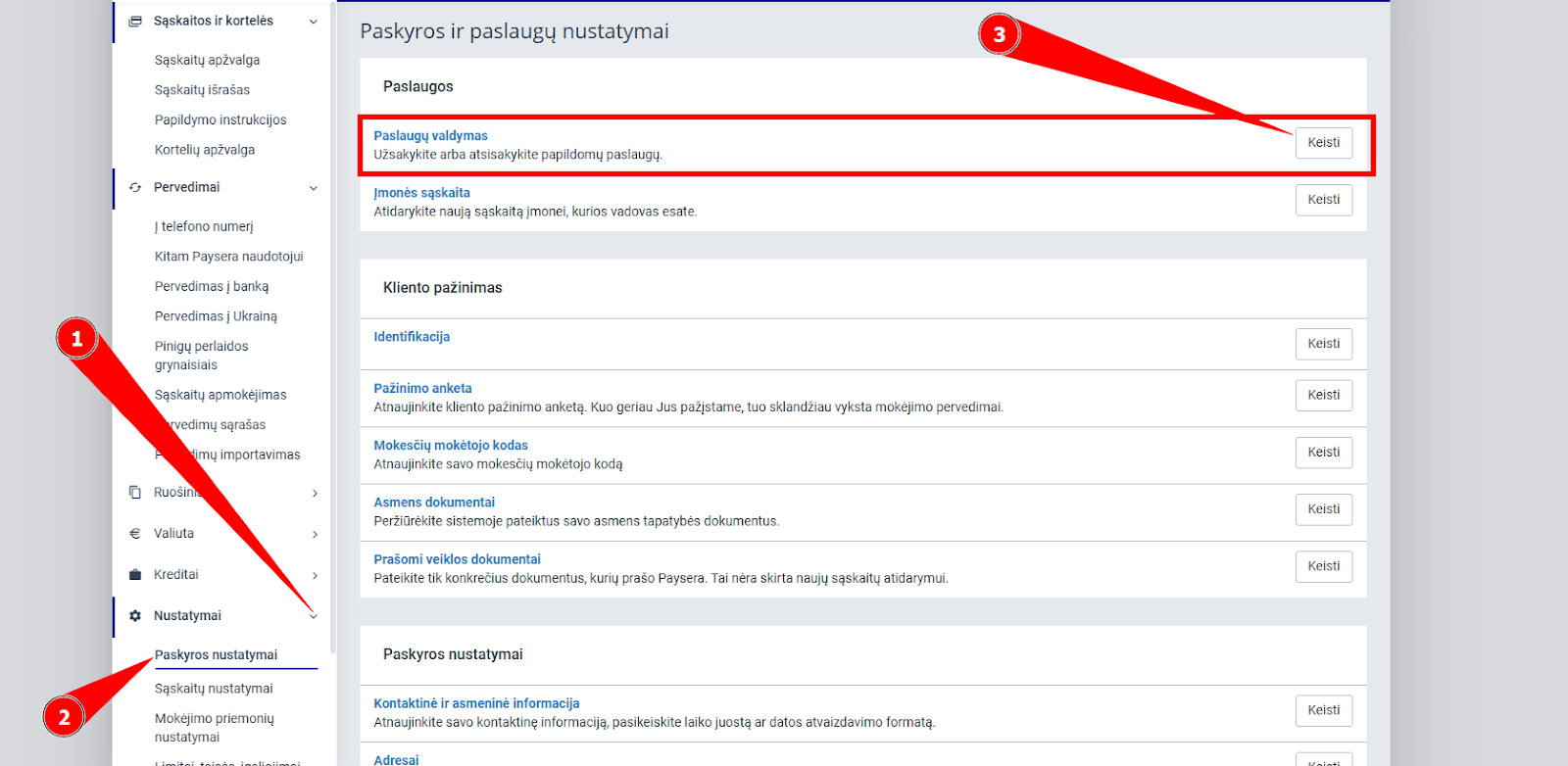 Norint įjungti įmokų surinkimą savo paskyroje atidarykite Nustatymai > Paskyros nustatymai ir prie “Paslaugų valdymas” paspauskite Keisti: