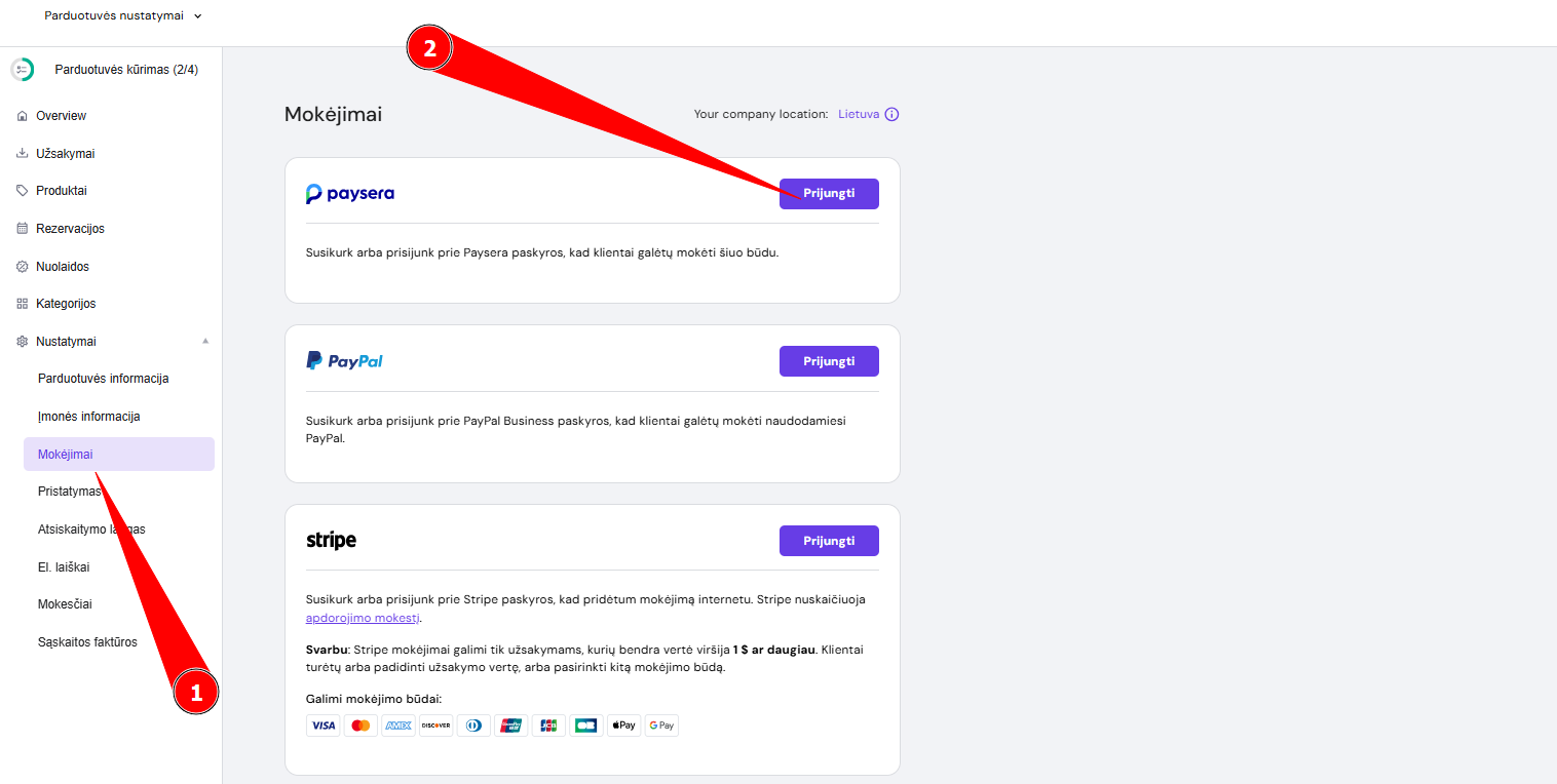 Atidarykite mokėjimų nustatymus savo parduotuvės valdyme ir prie Paysera pasirinkimo spauskite Prijungti: