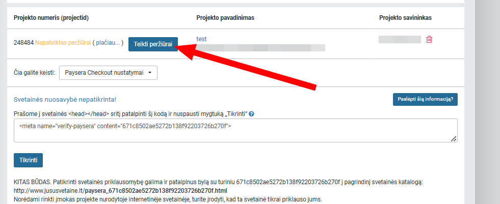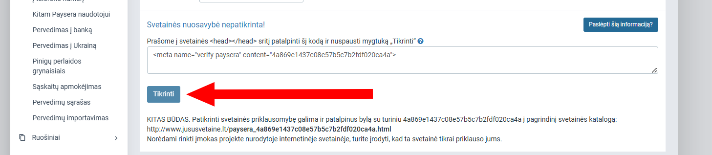 Po svetainės atnaujinimo vėl užeikite į Payseros paskyrą ir patvirtinkite svetainės nuosavybę: