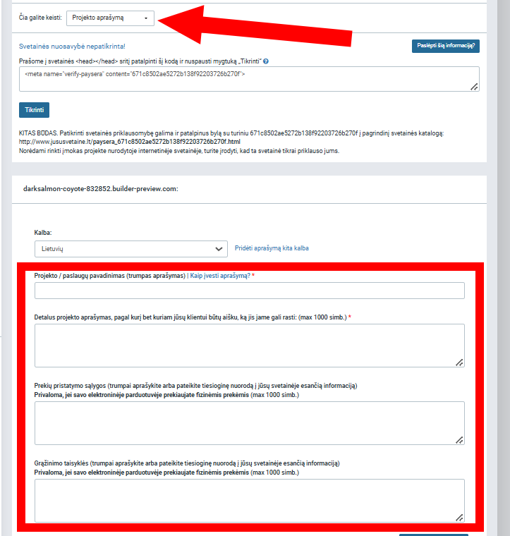 Būtinai įsitikinkite, jog pilnai užpildėte projekto aprašymą įskaitant prekių pristatymo sąlygas ir grąžinimo taisykles: