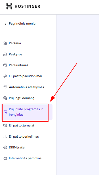 Hostinger el. pašto paskyros konfigūracijos duomenys nurodyti žemiau: