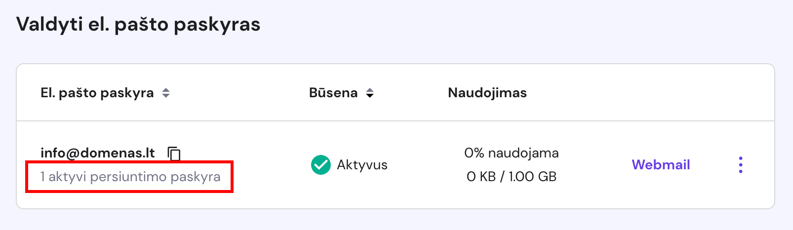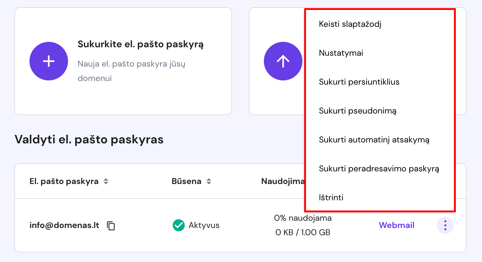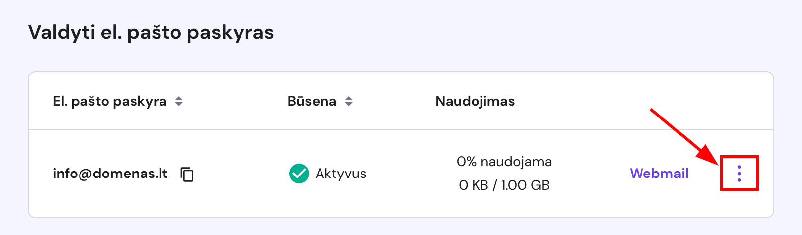 Skiltyje Valdyti el. pašto paskyras galite rasti visą informaciją apie savo el. pašto paskyrų adresus, statusą, disko naudojimą, taip pat greitai prisijungti prie Webmail. Čia taip pat rasite Parinkčių (⋮) mygtuką: