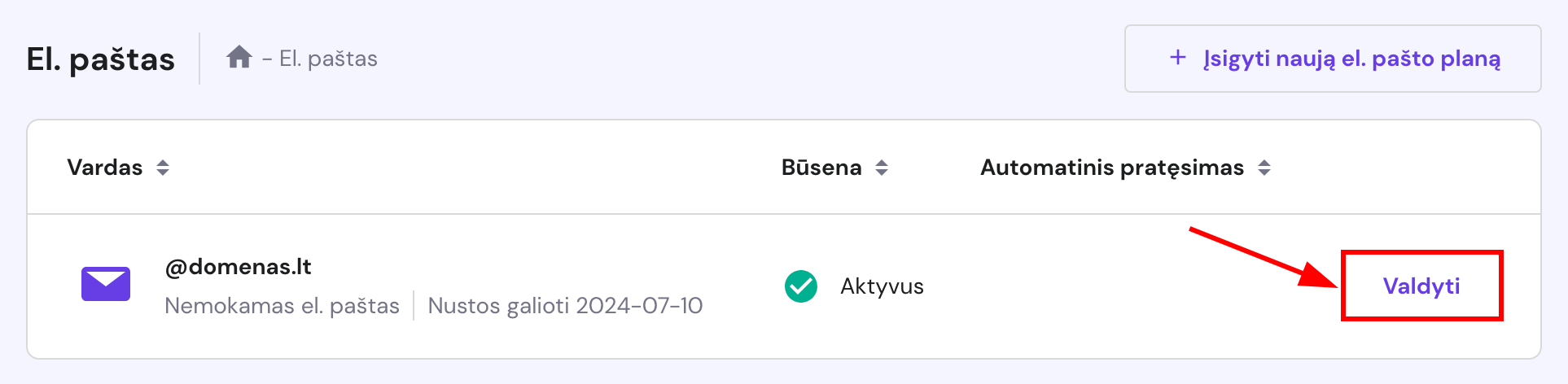 Savo el. pašto paskyras hPanel valdymo skyde valdyti itin lengva. Meniu juostoje pasirinkite skiltį El. paštas ir šalia savo domeno ar subdomeno spustelėkite Valdyti.