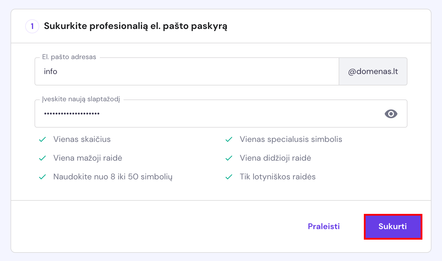 Įrašykite sugalvotą el. pašto adresą, pridėkite reikalavimus atitinkantį slaptažodį ir spustelėkite Sukurti: