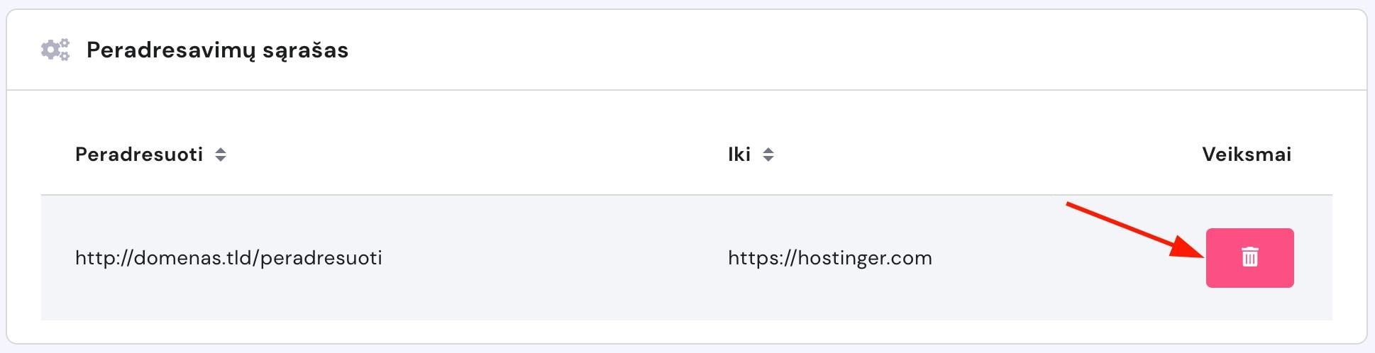 Sukūrus peradresavimą, jis bus matomas peradresavimų sąraše puslapio apačioje. Prireikus, visada galėsite jį ištrinti:
