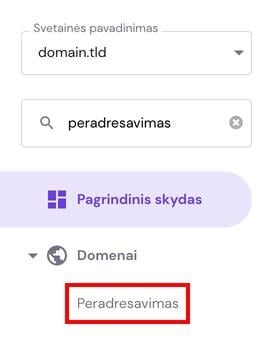 Įėję į Peradresavimo skiltį, galėsite pasirinkti domeną, kurį norite peradresuoti. Taip pat, jei reikia, galėsite nurodyti konkretų adreso kelią ir pasirinkti URL arba IP adresą kaip paskirties vietą: