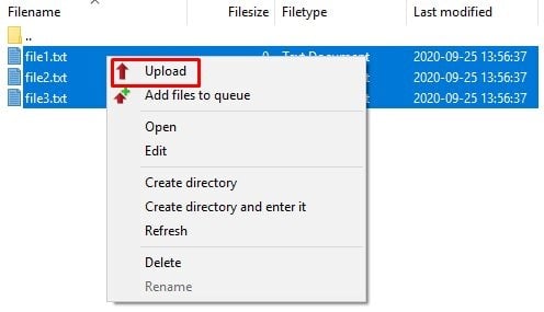 Kairėje pusėje pasirinkite katalogą arba failus, kuriuos norite įkelti, spustelėkite dešinįjį pelės klavišą ir pasirinkite Įkelti (angl. Upload).