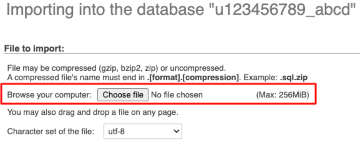 Įsitikinkite, kad jūsų importuojamo failo formatas yra .sql. Duomenų bazę taip pat galite suglaudinti ir importuoti šiais formatais: .gzip, .bzip2 ir .zip (pvz., database.sql.zip).
