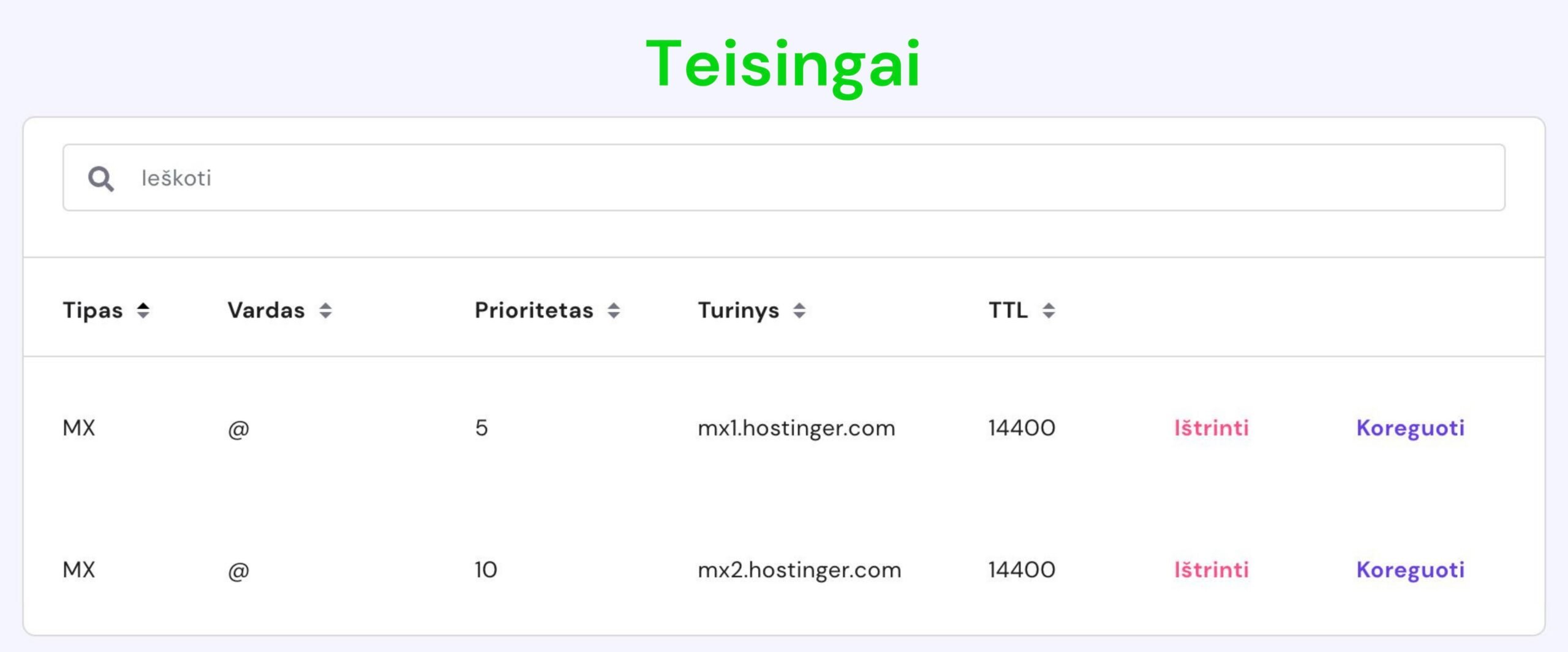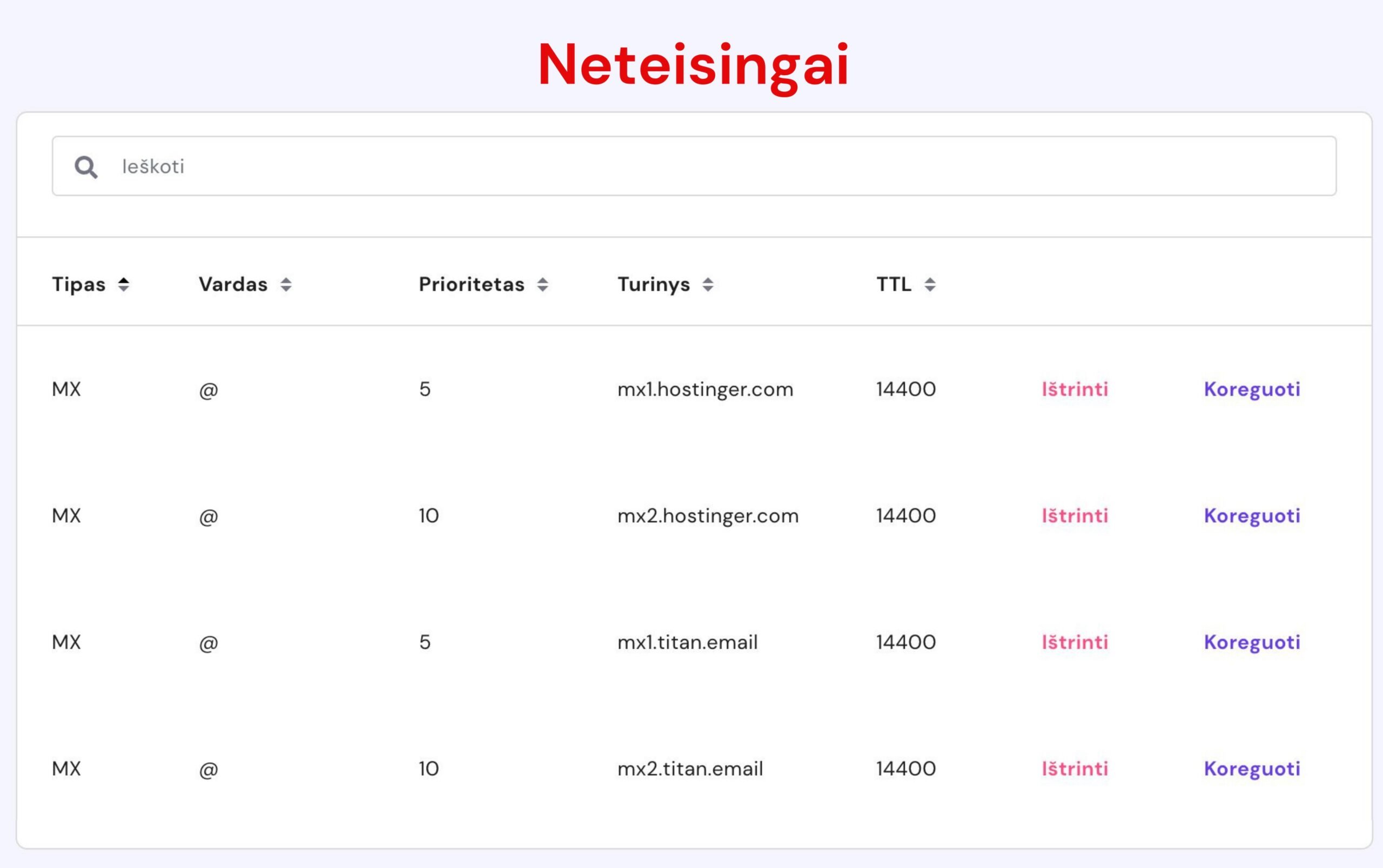 Kad jūsų el. paštas veiktų tinkamai, pridėkite visus reikiamus DNS įrašus (MX, SPF ir DKIM). Patikrinkite, ar visi ankstesni MX, SPF ir DKIM įrašai ištrinti. Palikite tik Hostinger el. pašto įrašus.