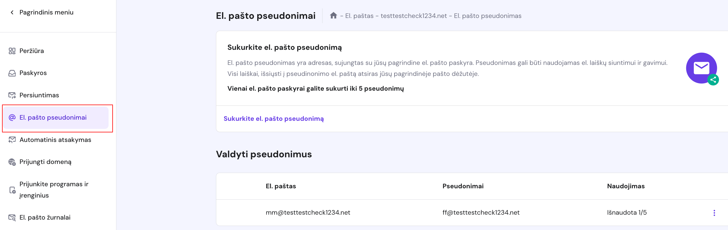 Nuo šiol „El. pašto pseudonimų“ sekcijoje galėsi matyti ir valdyti visus el. pašto pseudonimus.