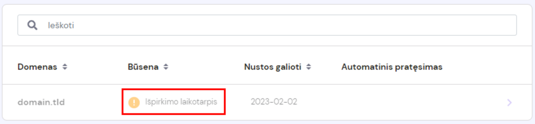 Priklausomai nuo aukščiausiojo lygio domeno (angl. TLD; pvz., .LT, .COM ir t.t.), domenas patenka į lengvatinį arba išpirkimo laikotarpį. Šį statusą matysite savo Hostinger paskyros skiltyje Domenai. Jei domenas yra lengvatiniame (atidėjimo) laikotarpyje, užvedę pelę ant šio statuso matysite, per kiek laiko galite atnaujinti domeną iki tol, kol jis pateks į išpirkimo laikotarpį:
