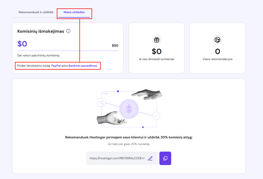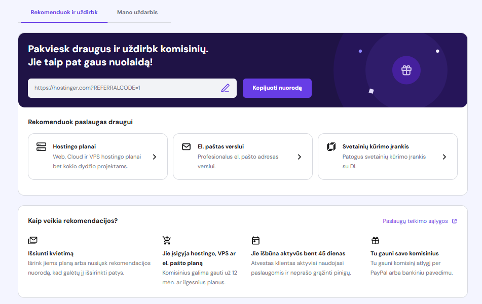 Kita vertus, jei tiesiog norite pakviesti keletą savo draugų naudotis Hostinger paslaugomis, jums visiškai užteks mūsų rekomendacijų programos. Rekomenduodami Hostinger, galėsite šiek tiek užsidirbti, o jūsų draugai gaus papildomą nuolaidą.