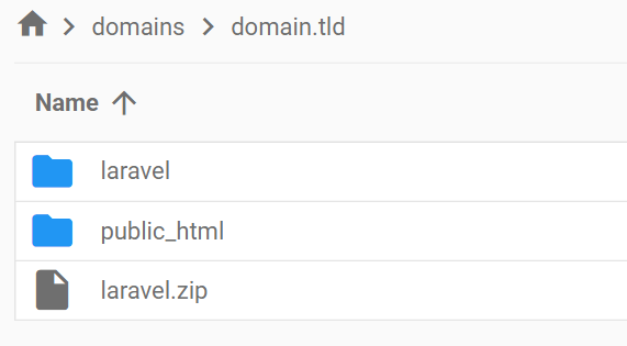 Įkelkite savo Laravel svetainės failus per failų tvarkyklę vienu lygiu aukščiau nei public_html aplankas. Jei savo projektą pavadinote laravel, failų struktūra turėtų atrodyti taip, kaip pateikta žemiau esančioje ekrano nuotraukoje.