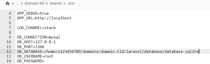 Jei norite naudoti SQLITE, eikite į failų tvarkyklę, eikite į laravel/database/ ir sukurkite failą database.sqlite . Tada atidarykite laravel/.env failą ir atnaujinkite savo duomenų bazės informaciją. Tiesiog nukopijuokite kelią į savo šakninį katalogą ir pakeiskite public_html į laravel/database/database.sqlite . Tai turėtų atrodyti taip: