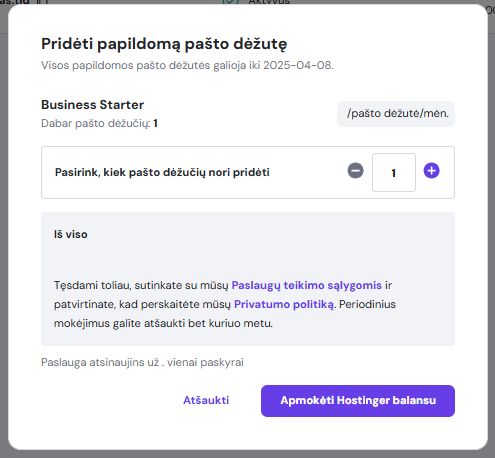 Papildomos pašto dėžutės kaina priklauso nuo jūsų el. pašto plano galiojimo pabaigos datos, nes visos jūsų el. pašto dėžutės privalo turėti tą pačią galiojimo datą.