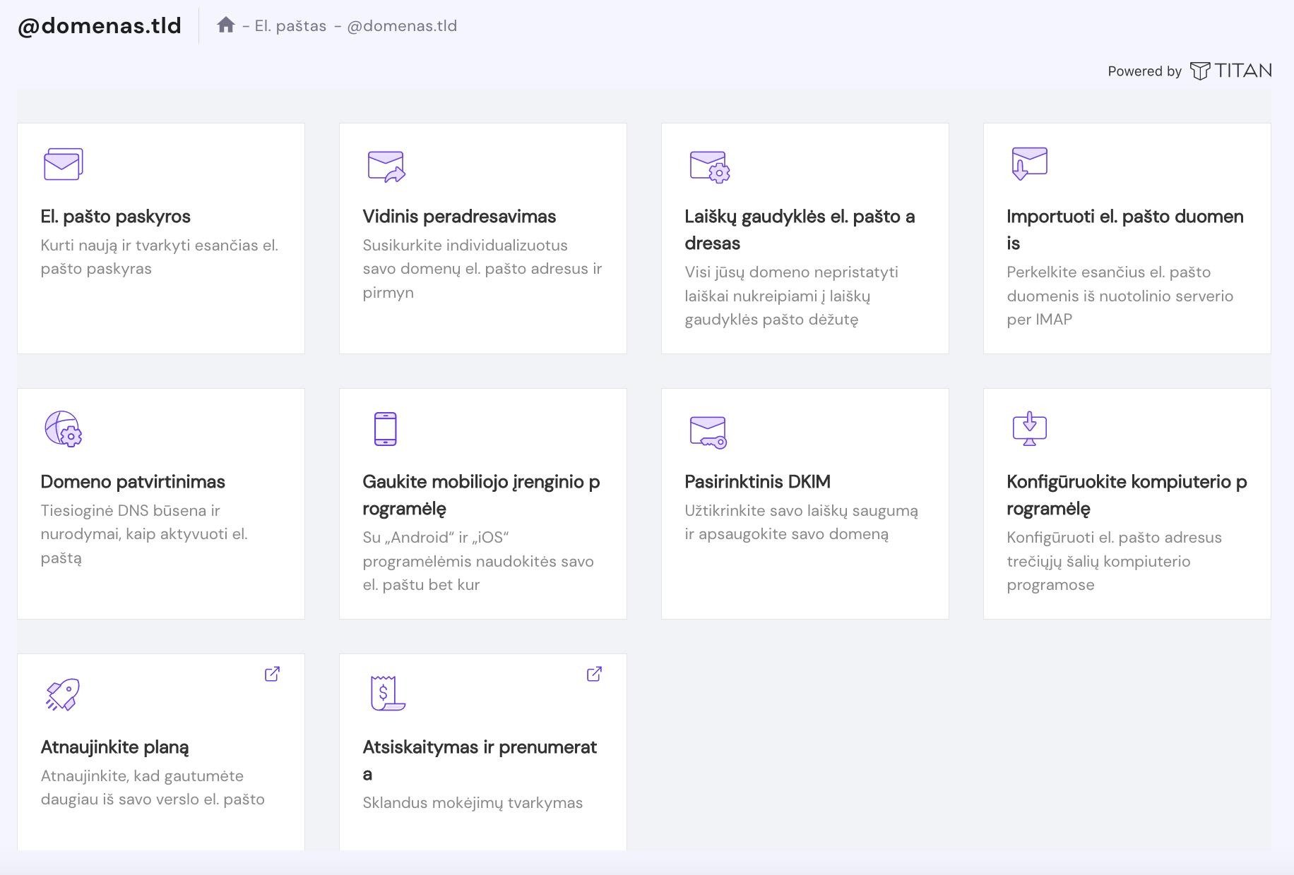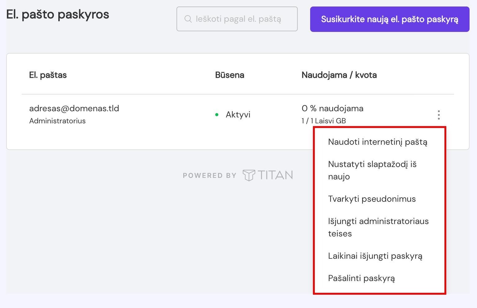 Savo el. pašto paskyras galite lengvai tvarkyti naudodamiesi skiltimi El. paštas, kurią rasite viršutinėje hPanel valdymo skydo meniu juostoje. Tiesiog pasirinkite El. paštas → jūsų domenas. Atsidursite Titan el. pašto paskyrų puslapyje.
