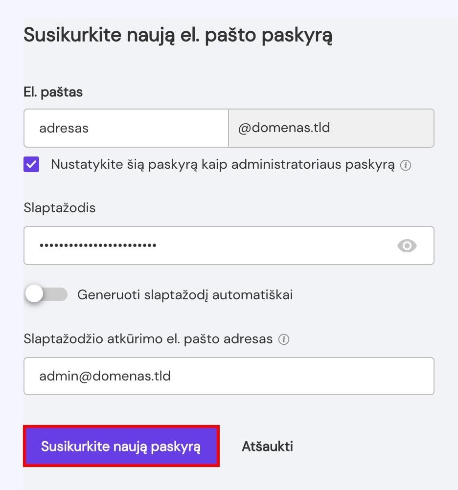 Įveskite el. pašto adresą ir pasirinkite, ar norite, kad tai būtų administratoriaus paskyra. Sukurkite slaptažodį, pridėkite slaptažodžio atkūrimo el. pašto adresą ir spustelėkite Susikurkite naują paskyrą.