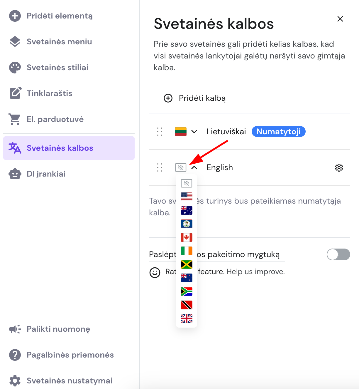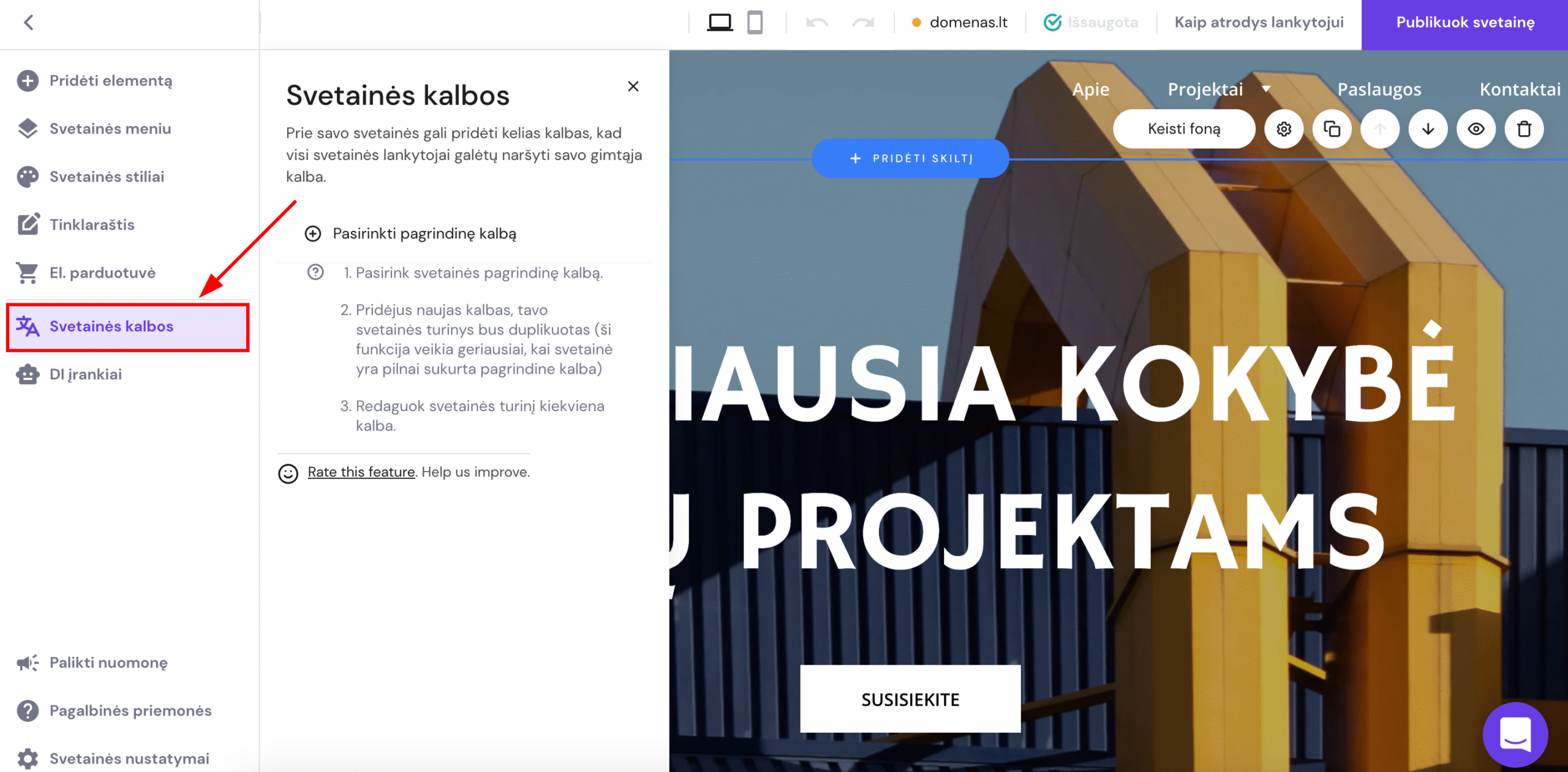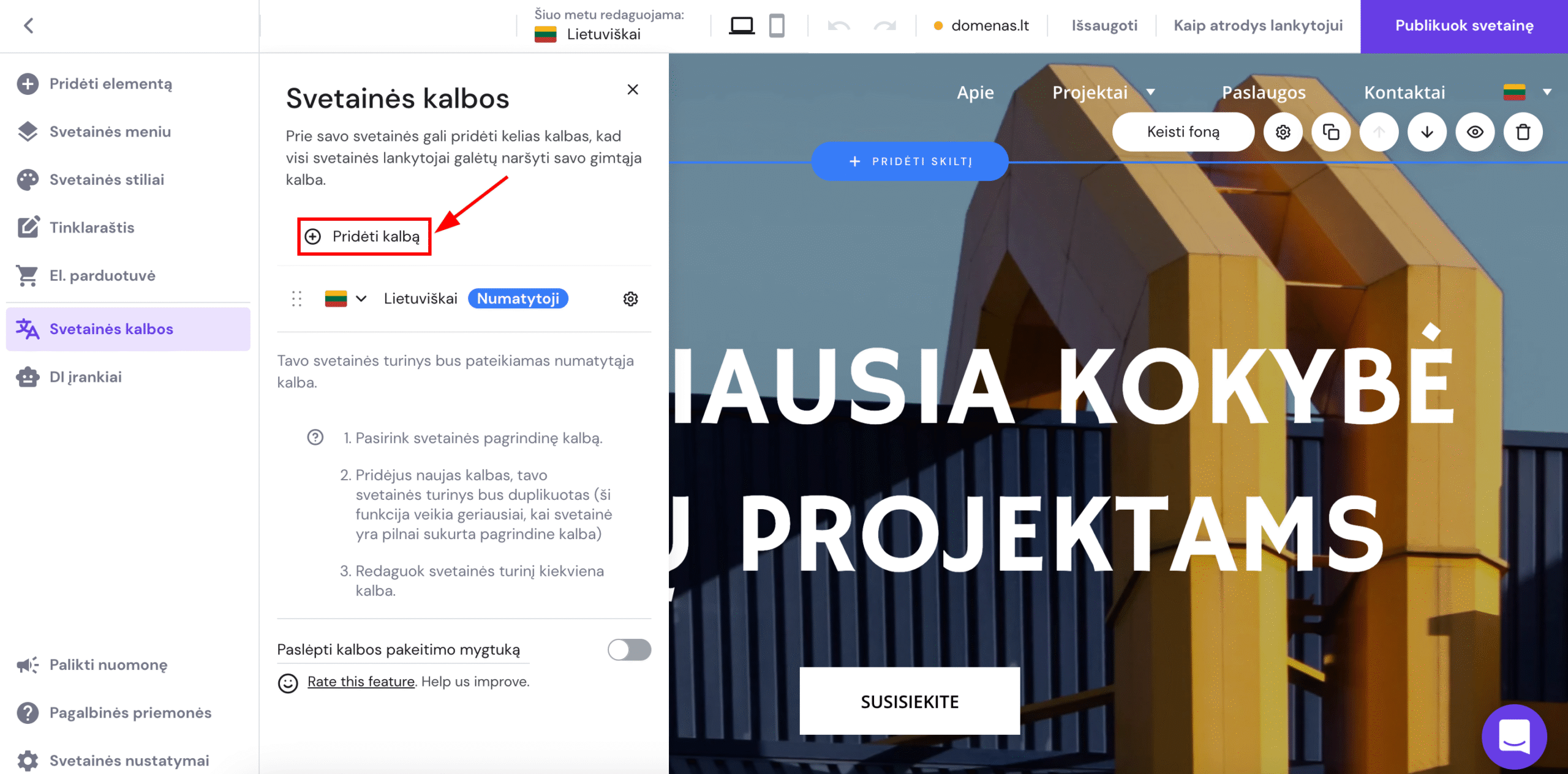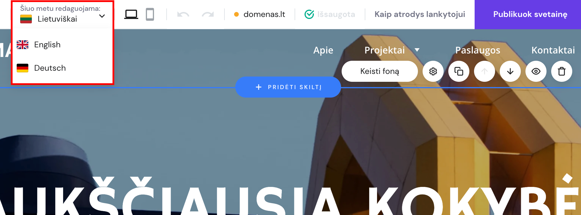 Naudodami Hostinger svetainių kūrimo įrankį, svetainėje galite lengvai pidėti daugiau kalbų.