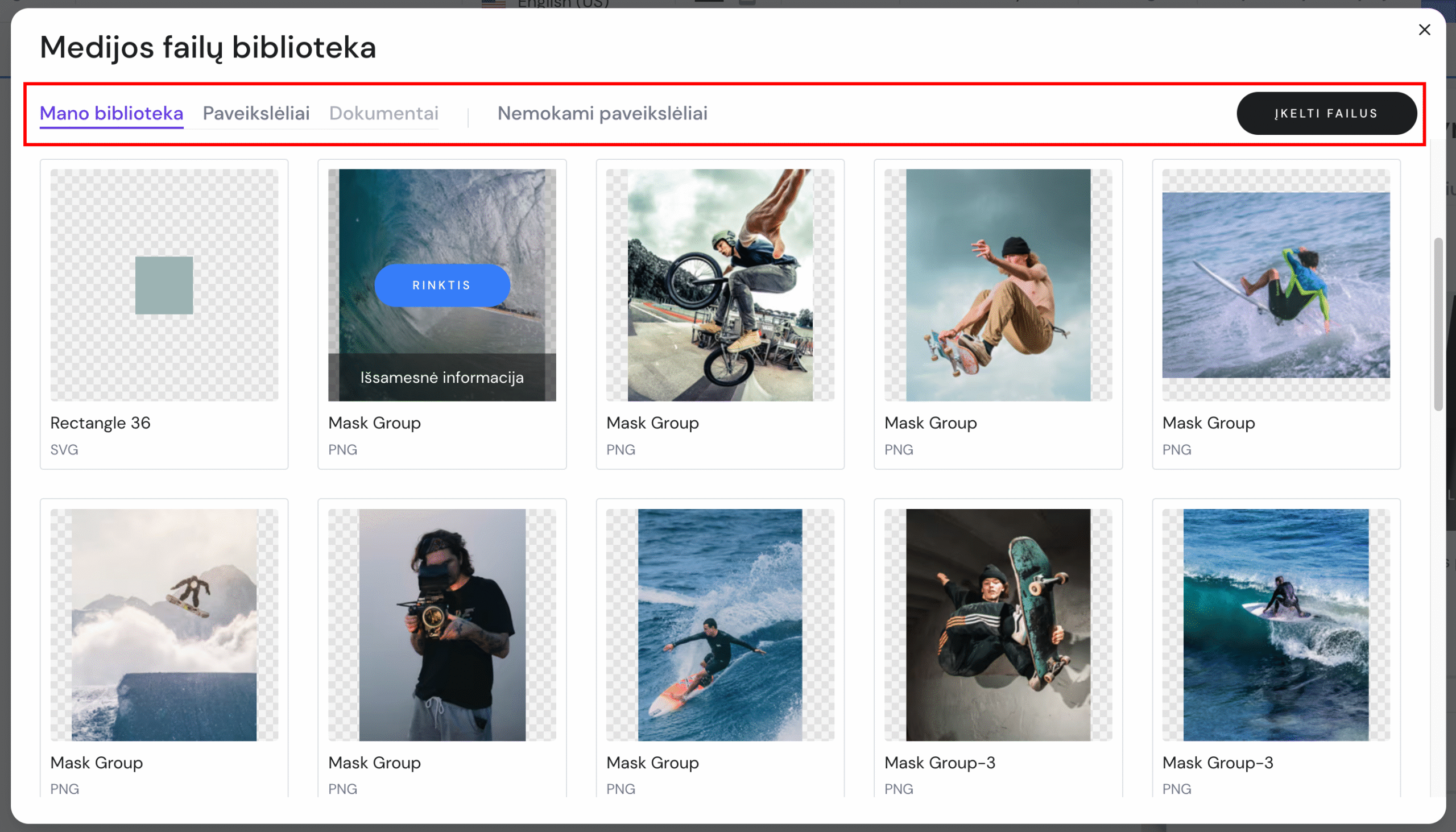 3. Rinkitės iš paveikslėlių mediatekoje, nemokamų paveikslėlių ar įkelkite savo: